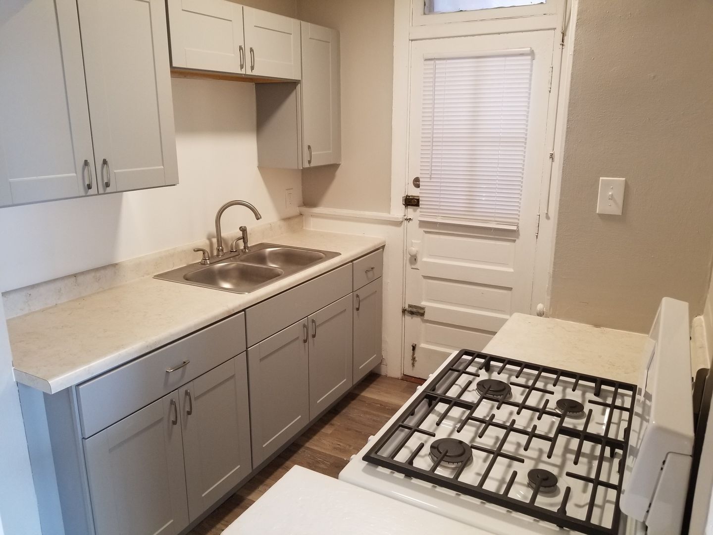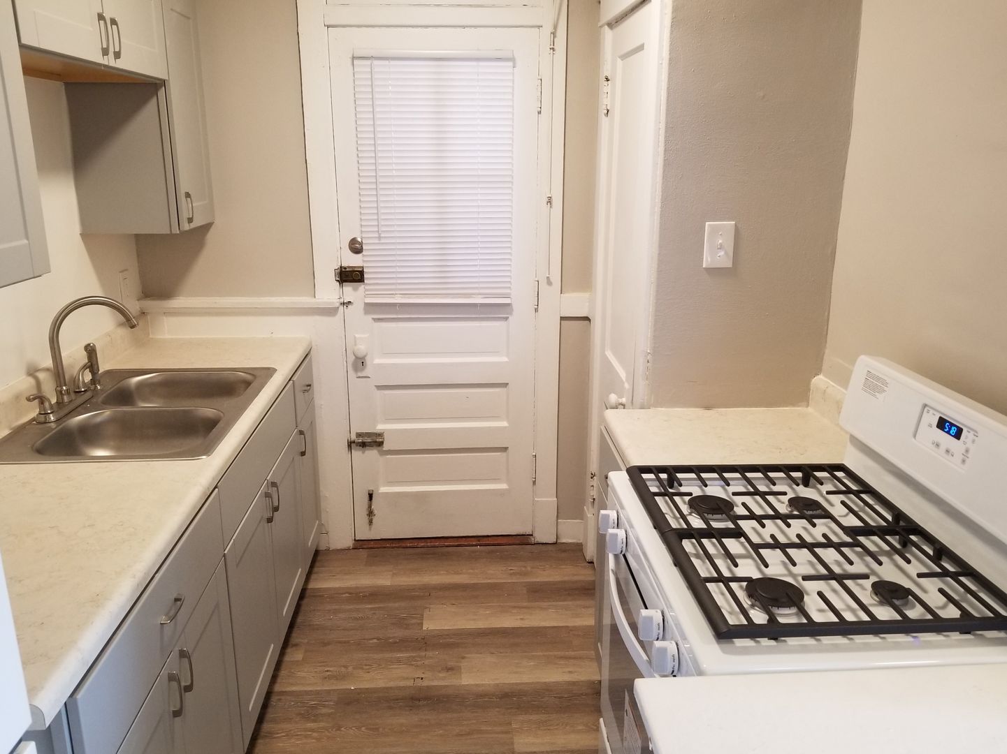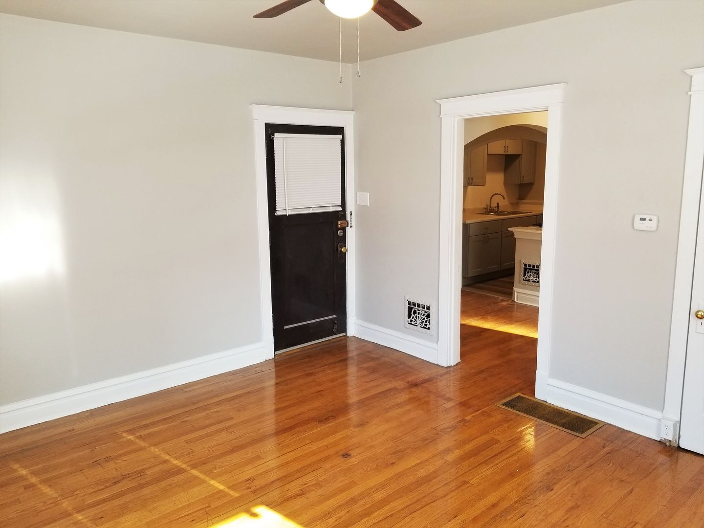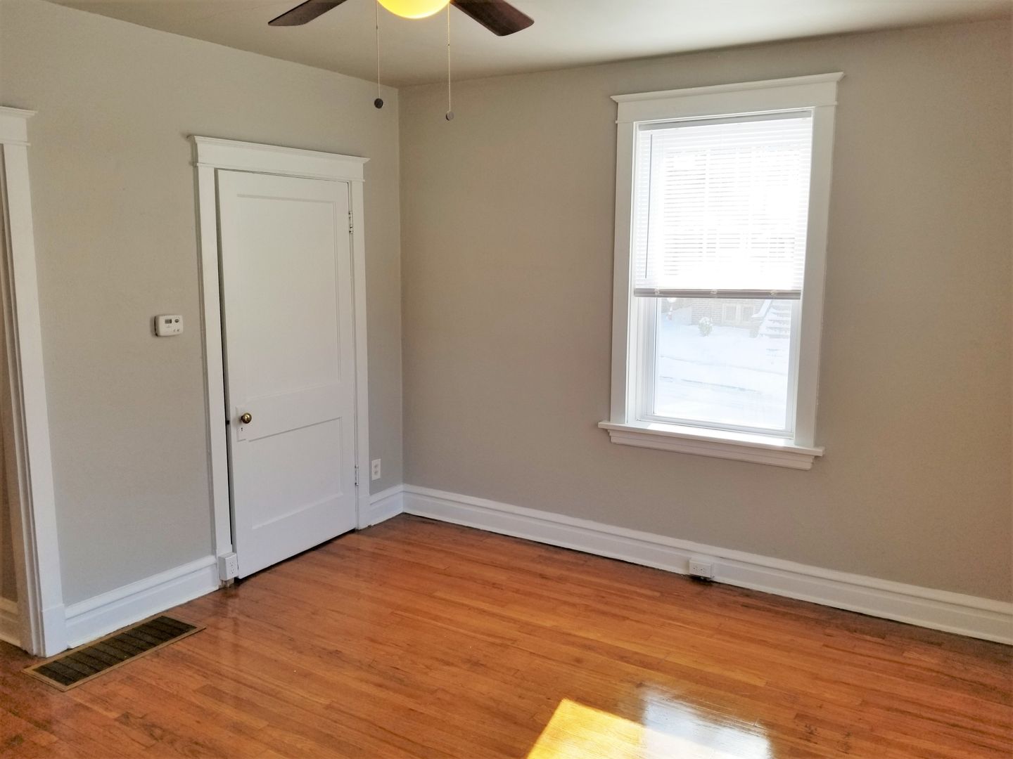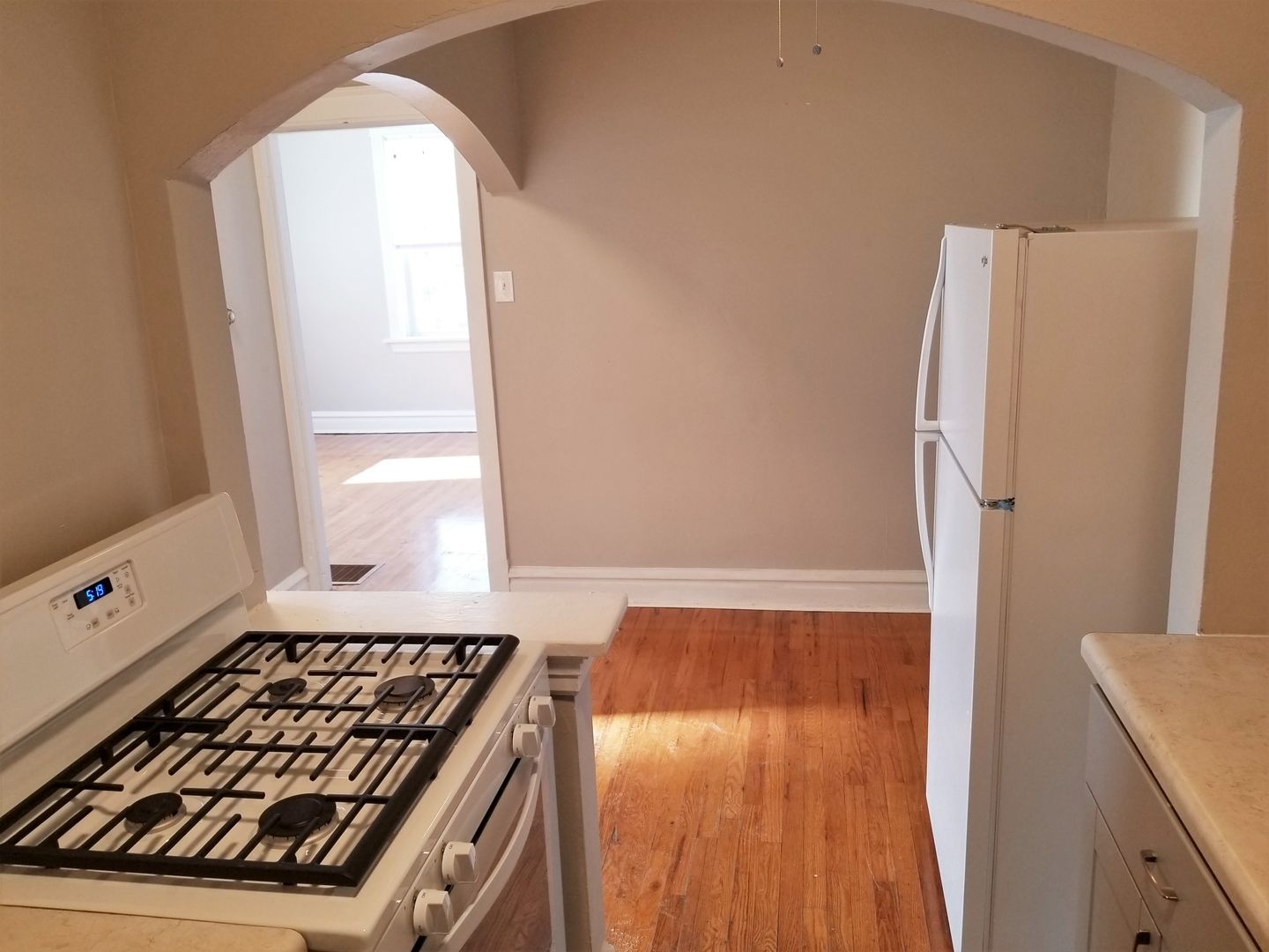 It features hardwood floors in the living room and bedroom as well as vinyl flooring in the kitchen and bath. The kitchen comes equipped with a gas range, pantry, refrigerator, and an ample eat-in area with a ceiling fan.